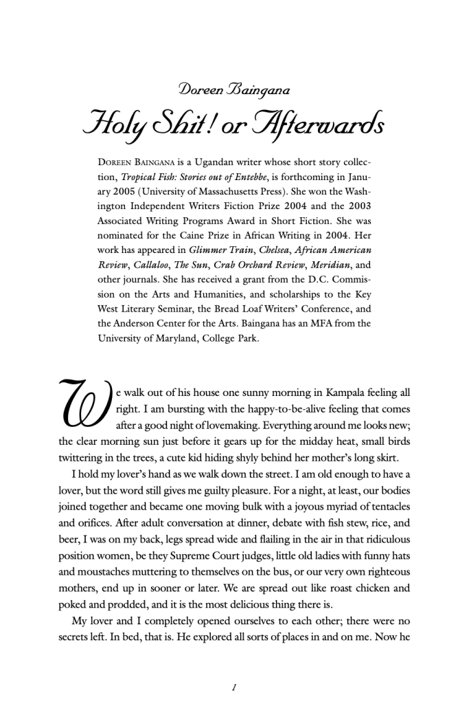 Baingana’s writing so often focuses on physicality. She takes great care in examining the corporeal, even when she isn’t specifically discussing themes of sexuality. Baingana published a short story earlier this year called “Her Gorgeous Body,” in which the main character’s comfort in her body is a vital piece of her sense of physical and emotional belonging. That piece is more recent than “Holy Shit! Or Afterwards” by almost two decades, so I think that this consistent vision of corporeality shows us how important honest portrayals of the physical body are to Baingana. Throughout her work, there is a shared authenticity in her depiction of the body: it is imperfect, ugly, and gorgeous by the very fact of its existence. Her prose is raw. It flows in the most natural of ways, so that as you read about these bodies you become them. This awareness of the physical is a crucial reason why “Holy Shit! Or Afterwards” is such a profound piece of writing; it presents sensuality in a way that connects sex to the most grotesque parts of our human condition, and it emphasizes the lack of true distance between them.