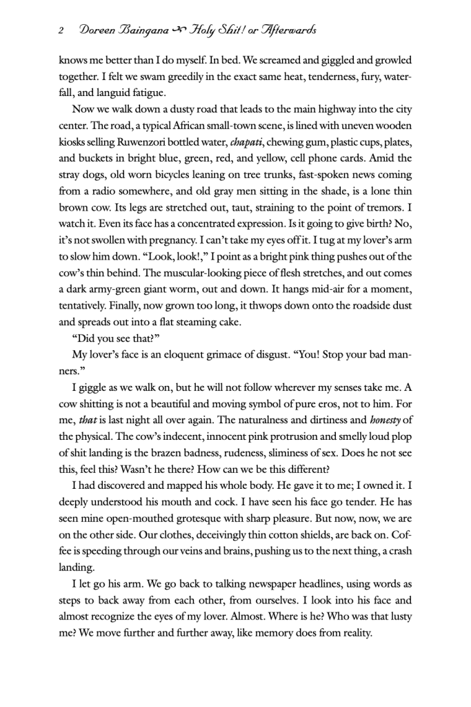In reading Doreen Baingana’s “Holy Shit! Or Afterwards,” I am left warm, weary, and filled with a kind of satisfaction that I so rarely find outside of the bedroom. I was not raised in Uganda, and I was not born with the gift of a female body, but the questions asked here nonetheless pierce me. Those questions—what role sex plays in comprehending the self, and whether or not sex is really so far from the other natural things in life—are familiar to me. They mirror thoughts I have alone in the dark, when the shape of my being comes into focus, and I can find silence enough for introspection in the space between ragged breaths. This piece is a consideration of vulgarity. It examines how the nature of this world and our place within it is crass, and how the denial of this fact detaches us from reality.