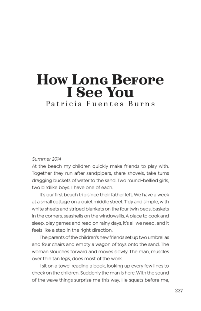 Burns has been published in an array of different journals dedicated to pushing the boundaries of typical writing conventions and with a dedication to unique writing that shares a potent message, such as Jellyfish Review, the Quarter After Eight, Quarterly West, and the Georgia State Review. By highlighting the complexity of the human experience, her stories harbor feelings of hope and sadness that are inevitable when examining the hardships that others are going through; however, it also provides a kind of relatability for readers. We can empathize with them. This is especially true in “How Long Before I See You” which allows the compelling story to permeate our subconscious and call on us to reflect on our own lives.