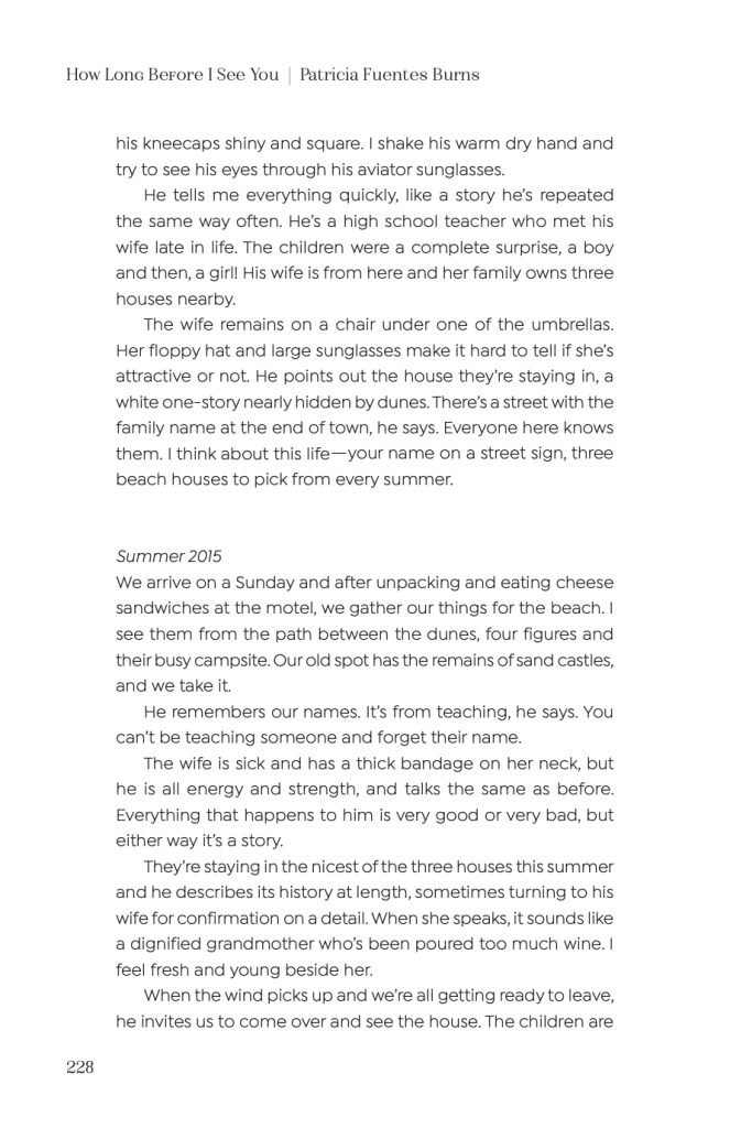 “How Long Before I See You” follows the life of a single mother and her children. Written in the first person, we live the family’s three summer trips – each in a different year – through the eyes of the mother. The story’s structured in fragmented sentences causing pauses in the story that showcase what the mother observes and focuses on. They are important in helping us understand the main character in that we observe the experience along with her. The story centers around the main character and her newfound relationship with people she meets on these beach trips: an older man, his wife, and children. Though Burns’ sentences are short, they are descriptive and tell what strikes the story’s protagonist. She immediately takes notice of the appearances of the man and woman that she meets and notes the stark differences between them. Where the older woman “slouches forward and moves slowly”, the man has “muscles over thin tan legs.” This brings our attention to the difference in the health of the couple. The man introduces himself to our main character and tells his story. He is lively and happy and seemingly proud of the life he is living. By the end of their first encounter, it is obvious that the protagonist envies the life of the couple. It is the last thing she mentions: “I think about this life – your name on a street sign, three beach houses to pick from every summer.” This life is one most people wish to attain. It seems like a life of little hardship and immense happiness. The man is living a life of light while our protagonist is stuck in a moment of darkness.