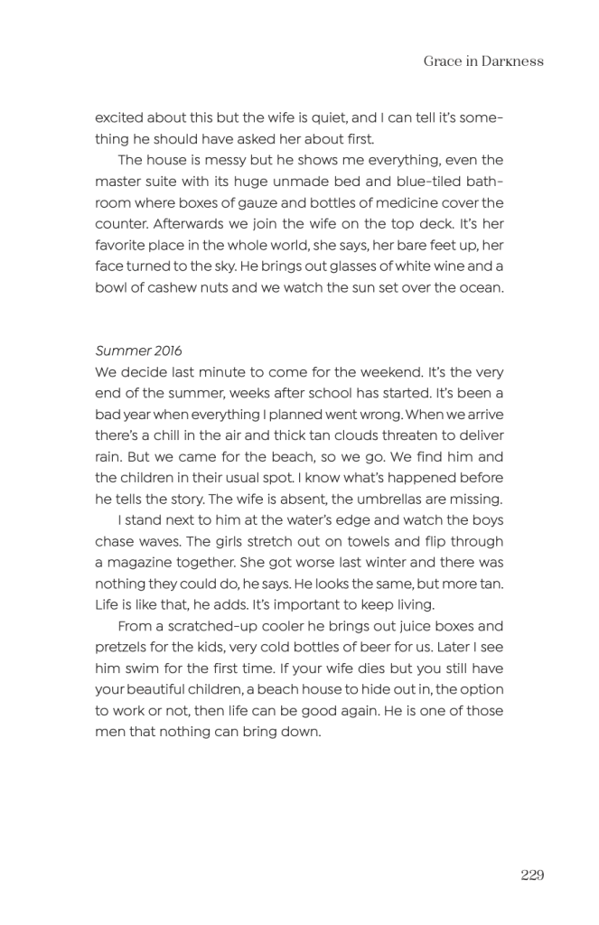Lastly, the Summer of 2016 ends the story on a sad yet heartwarming note. The section begins with our protagonist describing the turbulence of her year. Their family goes back to the beach a final time only to be met with “a chill in the air” and “thick tan clouds” threatening rain. Already, the setting illustrates an air of somberness – of tragedy. She comes to find out that in the time she has been gone, the older man’s wife has died. Despite this tragedy though, he states, “Life is like that” and that “it’s important to keep living.” The main character notes that the man is more tan. He even goes for a swim later. It is peculiar that though his life has been struck by loss, he is still living a life that anybody would crave to live. This brings our attention to the idea of privilege. The main character notes, “If your wife dies but you still have your beautiful children, a beach house to hide out in, the option to work or not, then life can be good again.” This sentence can be perceived as strikingly envious. We can think back to the loss the main character experiences at the beginning of the story. She loses her husband through divorce and continues to struggle throughout the next three years. Yet, this man loses his wife, and is still tan, happy, and able to continue living without physical struggle. We can observe the obvious message of the story’s ending: that life is worth living through the hardships we experience – that we are strong enough to continue living despite unimaginable pain. But we can also view this message as layered and more complex in that we are strong enough to continue living despite unimaginable pain, but not everybody has the opportunity to live through this pain comfortably. Not only do people have to deal with the emotional turmoil of loss but also external circumstances that people in positions of power or immense privilege will never understand.