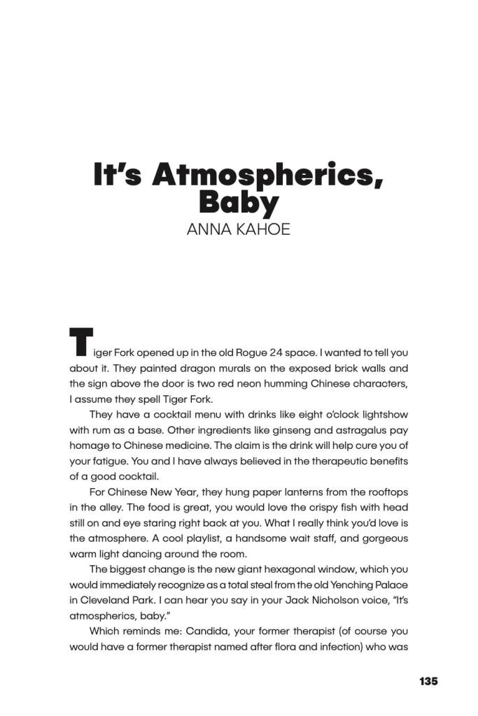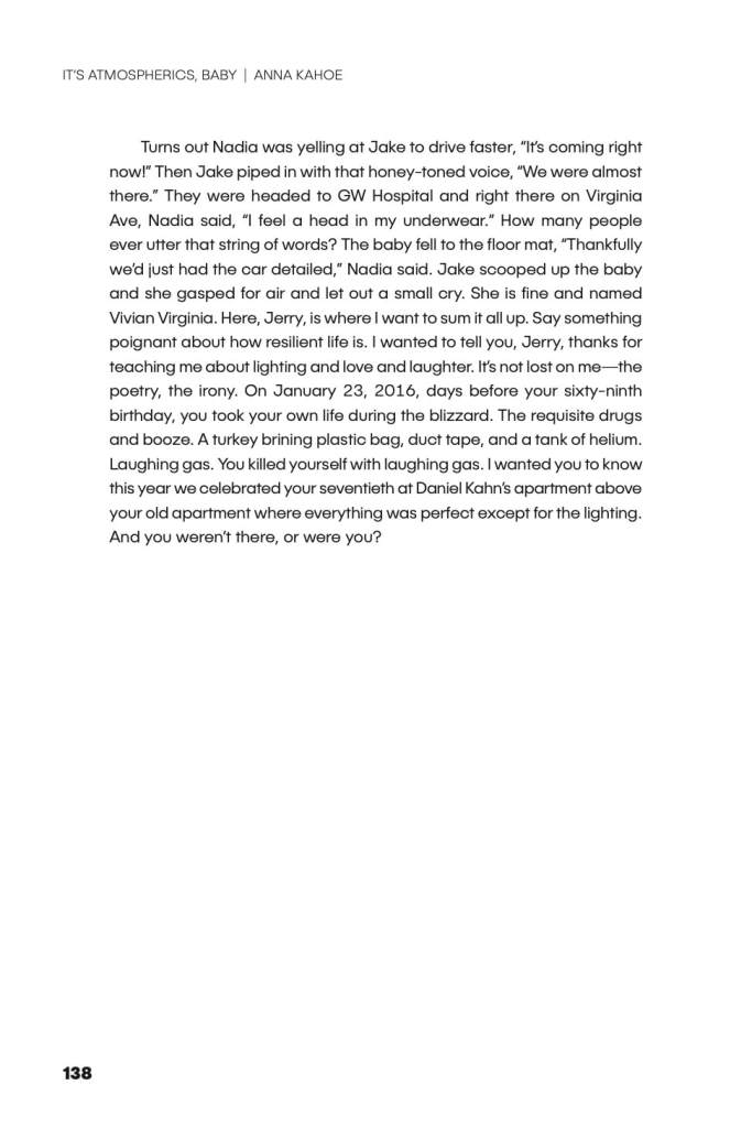 And yet, even with all the beautiful narrative choices that Kahoe makes, I find that what drew me to this story was the feeling that she was going to tell me about something that I could already sense, and that I had experienced it before too – that loss is both specific and universal and uncomfortable and unsolvable and unpredictable all at once, and that it makes you wish that you hadn’t let yourself become vulnerable to the devastation that love can breed. Kahoe eerily conveys the feeling of wanting to tell someone about the most miniscule of details: changes to their favorite restaurants, what will happen to their old watering holes, what you remember them saying and how it’s all starting to make sense now. Still, her writing teems with urgency and desire through the repetition of “it’s atmospherics, baby” and quick, short sentence structure – and yet, as a reader, I just feel grateful that I am able to stand as observer.