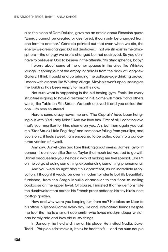 I am struck by “It’s Atmospherics, Baby” and its ability to place us in the homes and restaurants and shops and celebrations that hold our deepest emotions and serve our souls in ways that we never though imaginable. Mostly, I am filled with light – despite the reality of the bleak ending the Kahoe tells us and that we all know to be true. I am thinking of a Daniel in my own life and his dinner parties, thinking of the stories we tell each other (some to pass the time, some to share the extraordinary with those most deserving of it); thinking of the stories that we tell ourselves in an effort to extract something and grapple with anything, to somehow show our appreciation for the small things that really turn out to be the biggest things in the world; thinking of the atmospherics of it all.