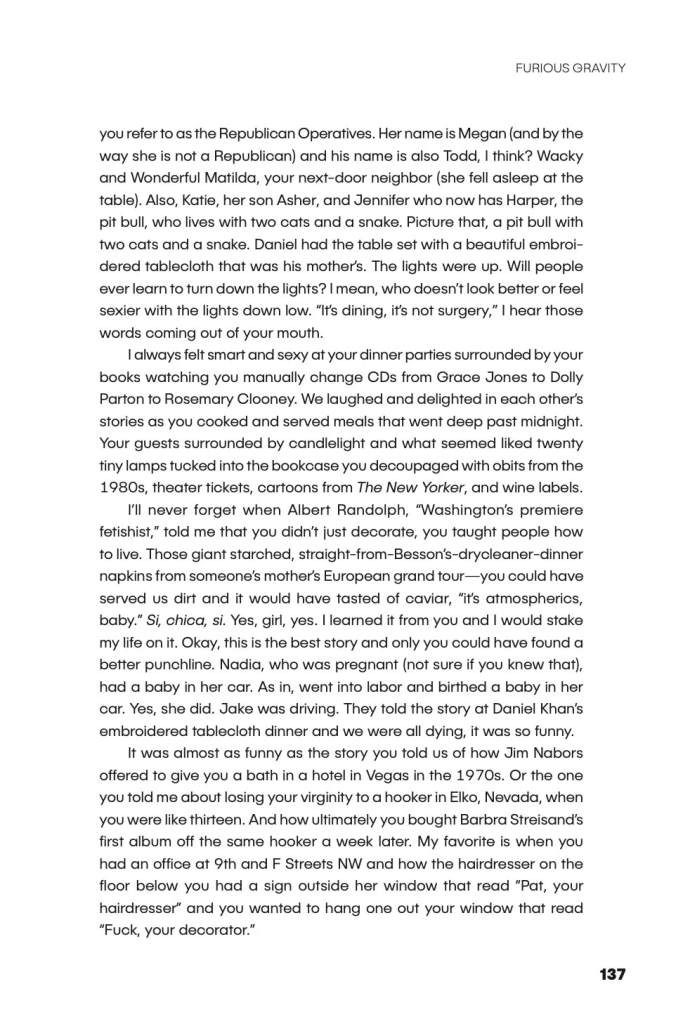 And Kahoe is, in fact, well-known. She is a reader and writer based in the DMV area and owned and operated GoodWood, an antique store located on U Street, for more than 18 years. She and her husband recently sold the business, but they are still deeply connected to the shop and the memories made inside of it. And after reading her work, it is clear that her reputation for unmatched taste and love for eclectic yet perfectly crafted, harmonious spaces is hardly an exaggeration. Her attention to detail when discussing “the Serge Mouille chandelier” and “those giant starched, straight-from-Besson’s-drycleaner-dinner napkins from someone’s mother’s European grand tour” not only convey this element of her, but also show the importance of atmospherics that the piece is centered around. It furthers her sense that it really is the small stuff that makes things what they are, the small stuff that reminds her of Jerry and reminds her to thank him for showing her that dirt can taste like caviar if the atmosphere is just right. It’s the small stuff that reminds her that people and atmosphere are not so different – that he made it what it was.
