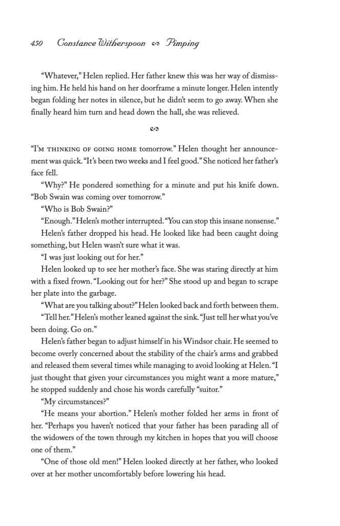 Such respect for her protagonist’s intelligence is vital given that the premise of the story, which feels especially relevant given it involves a woman’s right to choose, involves an inherently old-fashioned and dehumanizing scheme orchestrated by Helen’s father. Near the end of the story, Helen discovers that her father has been inviting over older men with the intent of having Helen date one of them. The necessity of this stems from Helen’s recent abortion, which Helen’s father feels renders her “prospects” to be “limited”. Given that Helen’s father does most of the talking during these encounters and that Helen even leaves halfway through one man’s visit, I get the mental image that Helen’s father is a medieval lord who is trying to quickly arrange a marriage for his pregnant daughter in hopes of avoiding shame. His treatment of her abortion as disgraceful and limiting of her “prospects” is reminiscent of the trope of the “fallen woman”. Helen even remarks upon the ridiculousness of his views, asking “Am I wearing a scarlet A?” and “What age are you living in?” Considering that the thought that no one would want her had not even occurred to Helen at this point, the entire undergoing of Helen’s father, and the fact that his top priority after his daughter has undergone this traumatic event is her marriageability, might even be laughable if it did not reflect such a depressing reality about the way women and their sexualities are viewed.