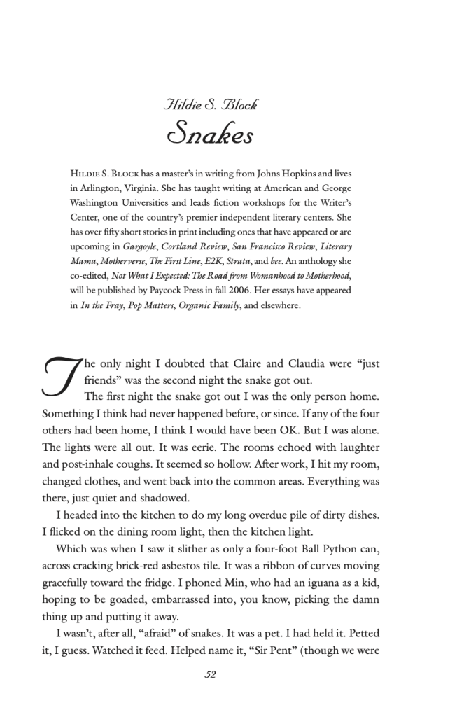 “Snakes” was initially published in 2006 as a part of the second volume of the Grace and Gravity Project entitled Enhanced Gravity. It is an excerpted story from a novel Block wrote about living in a group house not far from American University, where she spent some time teaching throughout the 2000s following the completion of her MFA at Johns Hopkins University. She’s written over 50 published short stories, which have been featured in print in various, distinguished publications. An anthology she co-edited, Not What I Expected: The Unpredictable Road from Womanhood to Motherhood debuted in 2006 and is available for purchase online here. Block’s work most gracefully tackles the gravity of everyday life. In her fictionalization of apparently mundane settings and characters, she imbues a sense of universality that is evocative of the undulations of a snake, slithering through life.