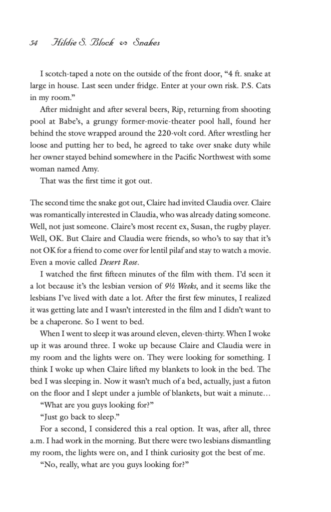From a critical perspective, “Snakes” is an obvious product of Block’s commitment to the practice of writing and channeling the world around her into honest, relatable fiction. What surprised me most about this piece was its use of both subtle, cerebral humor–a divorced male Nirvana fan’s snake in the closet of his queer ex-wife–and overt humor–a nameless person hysterically jumps atop a table to avoid an intruder in the kitchen, a la Tom and Jerry. I found myself rumbling with laughter reading these moments of irony and imagery, their lightheartedness intensified by their juxtaposition with the intimate and vivid details Block employs to describe the home itself, such as the “rooms [which] echoed with laughter and post-inhale coughs.” From the first line of “Snakes,” Block encircles the reader immediately into the narrator’s world, this community of people who take care of one another, who keep each other’s secrets, and herd each other’s cats away from a loose snake. She holds us here with this carefully crafted imagery, by letting us in on the inside jokes and making us feel like other neighbors of Sir Pent.