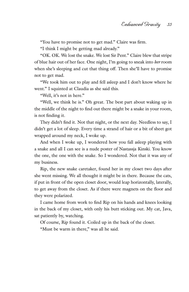 On the second occasion of Sir Pent’s escape, the python inadvertently lets the proverbial snake (read: cat) out of the bag when the speaker is awoken by two women in search of it. Claire admits that after the narrator observed her and her friend, Claudia (for whom Claire has romantic feelings), watching a queer-coded movie, the pair took Sir Pent out to play before falling asleep. The narrator, curious as to how anyone could sleep with a loose snake about and haunted by the idea of it in their room, can picture nothing that “nude poster of Nastassja Kinski. You know the one, the one with the snake” (which, though a bit before my time, even I remember). It was then that they couldn’t help but notice that perhaps Claire and Claudia weren’t “just friends” after all. When the snake is found a few days later, he is in the warm safety of our narrator’s closet—a metaphor that almost speaks for itself.