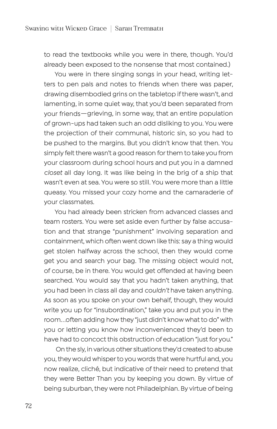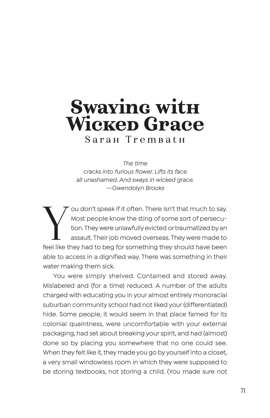 “Swaying with Wicked Grace” derives its name from the Gwendolyn Brooks poem “The Second Sermon on the Warpland” featured in the epigraph. The modification of “grace” captures the exasperation and mettle tethered to surviving a racist environment during developmental years. Sarah Trembath vocalizes the pain of her younger self through Brooks’ phrase. Both joy and pain activate her. Both “Good Educators” and “Bad Educators.” The classmates who watch her pain and the girls on the gymnastics team who see her pain.