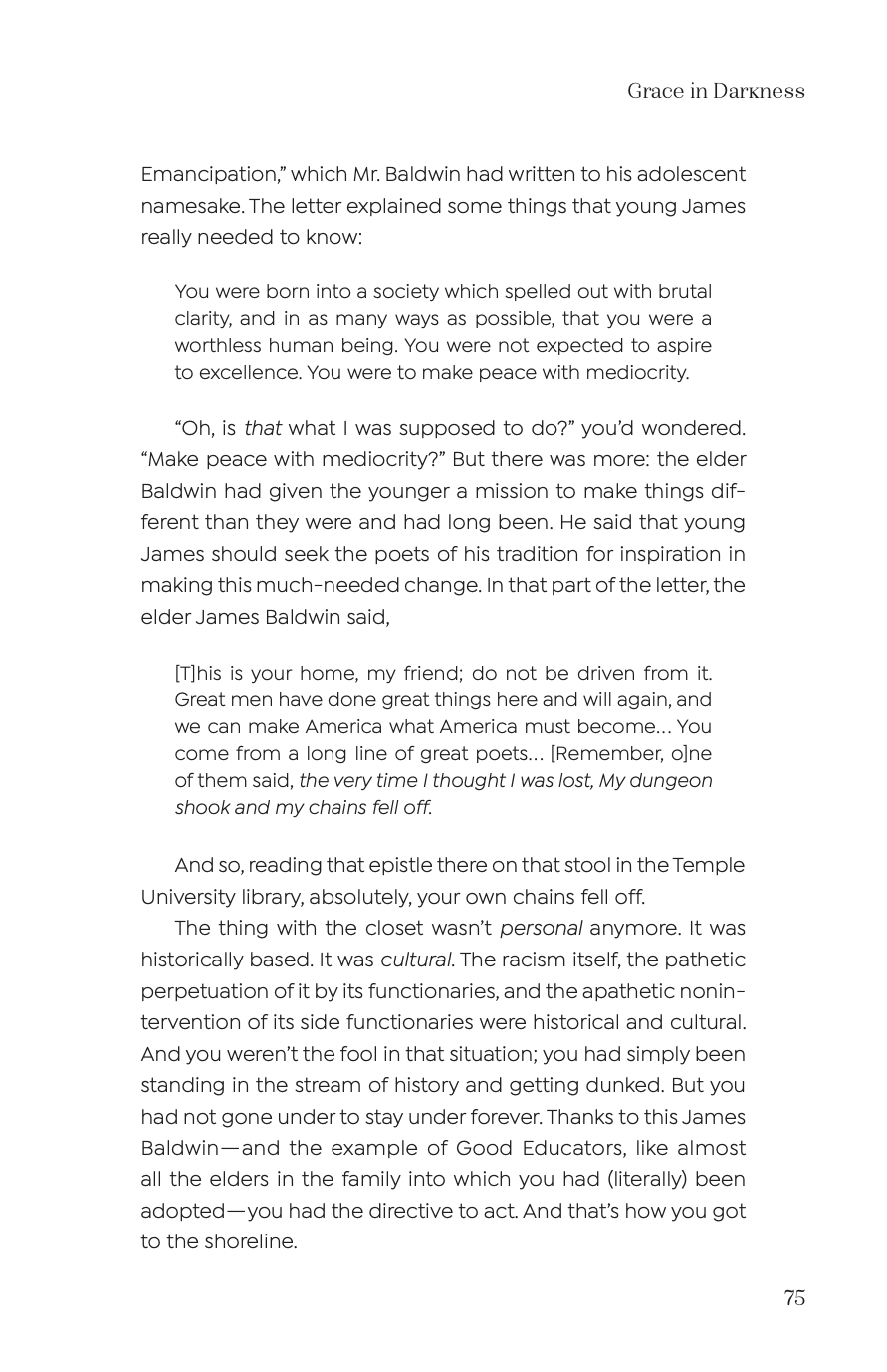Trembath also focuses on the books that affirmed her. She begins with Alice in Wonderland imagery, feeling like Alice as she tumbled down an “absurd rabbit hole” and stenciling the “grins” of Alice’s impish friend, the latter connecting to the “wicked[ness]” found in the title. Trembath found catharsis in “Letter to My Nephew on the One Hundredth Anniversary of Emancipation,” passages lifted and rehomed in her meditation. “Elder” James Baldwin among many others whom she lists are her literary godparents, the magic dust of their wand-pens transforming “you” into a commander of prose and poetry.