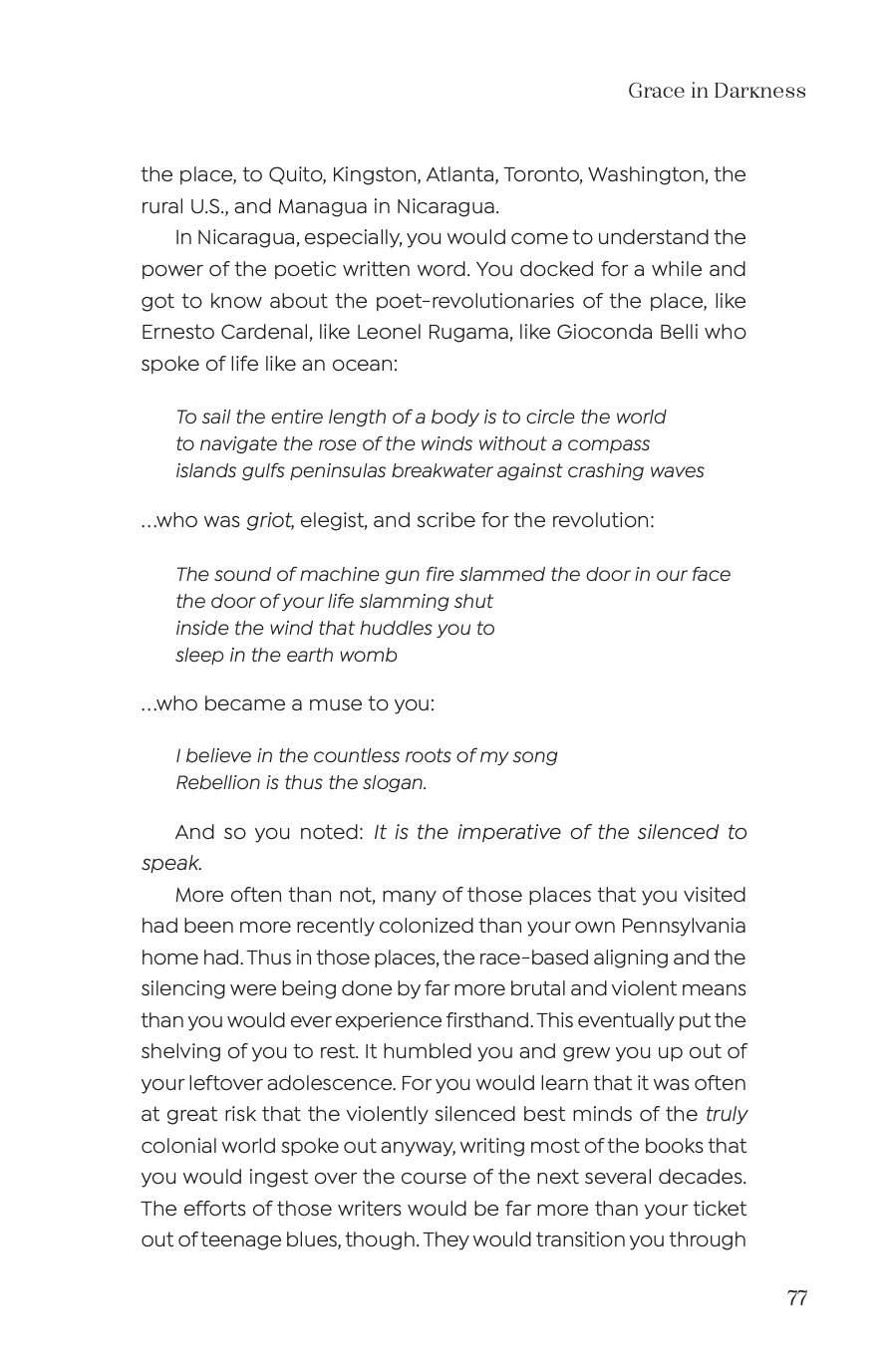 Trembath reminds herself and the audience that the voice is an instrument in delaying submergement. “It is the imperative of the silenced to speak.” And so she speaks, peeling away at the duct tape indented onto the child’s mouth, empowering her against the adult actors of her racial strife. Trembath knows silence, among “recant[ing]” and “cry[ing],” to be the goals of racism. She details how self-advocacy is the igniter of its biggest blaze. How dare you speak up? Speak back? The volume of Grace and Gravity in which this piece is excavated begins with a quote from Audre Lorde, “We’ve been taught that silence would save us, but it won’t.” Even as a little girl, Trembath knew that accepting silence was to accept defeat. And so she sang. She wrote love notes. She drew “disembodied grins.” She spoke. And now she teaches others to do the same.