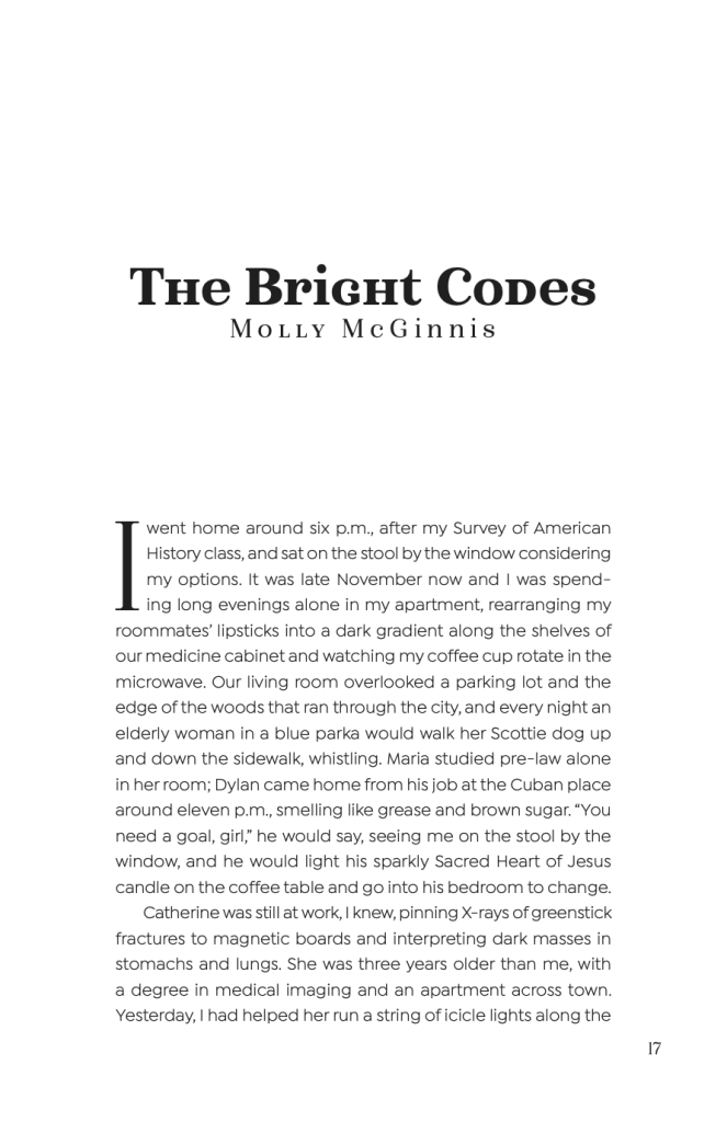 Since 2020, society on a global scale has had a tenuous relationship with physical reality. Now living in a COVID-endemic world, we seem to be split between occupying virtual realities with those we’ve never met in real life and reentering the physical world with unprecedented intensity. The digital world may allow for genuine connection, but it still has an air of unreality to it, and physical events that don’t have digital verification of their occurrence can feel just as unreal. COVID, an illness that spreads invisibly, has had the side effect of making some of our lives feel more and more physically unstable with no certainty of a full-bodied future on the horizon. Written in the backdrop of another invisibly spreading outbreak, Ebola, Molly McGinnis’ “The Bright Codes” speaks directly to how we can accidentally fade into the background and feel as if we’re disappearing. “The Bright Codes” is a masterclass in understanding the way that we minimize ourselves in the face of global uncertainty while gently leading us back to reality through human connection.