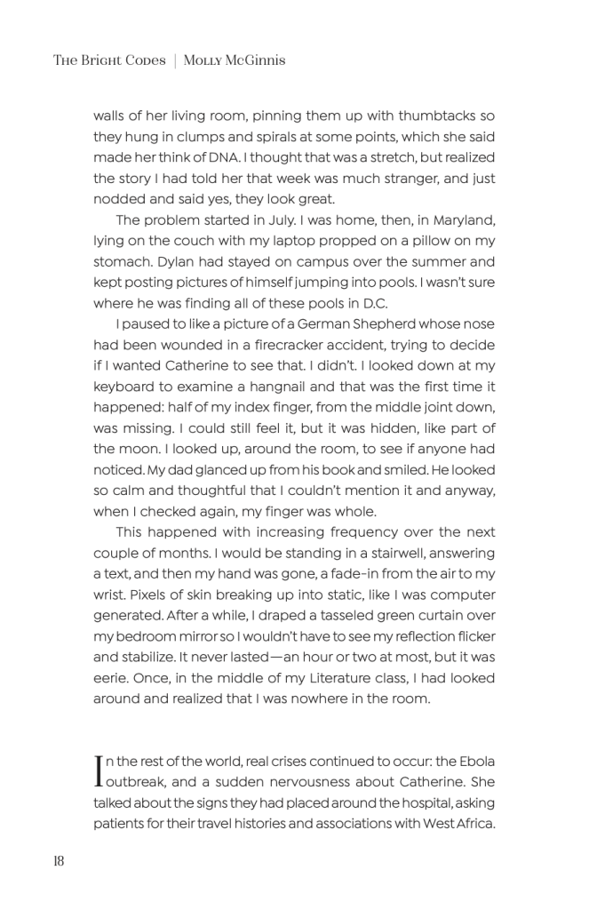 Invisible illness in all its forms—psychiatric, chronic, and endemic—is the core of this story. McGinnis originally began writing “The Bright Codes” during the 2014 Ebola crisis and began thinking about how Ebola was a “huge, invisible threat, where symptoms became visible only when it’s too late, and the other part of the threat was in its invisibility.” Within Lisa’s world, Ebola continues spreading while nobody pays attention in the same way that almost nobody notices Lisa’s decline.