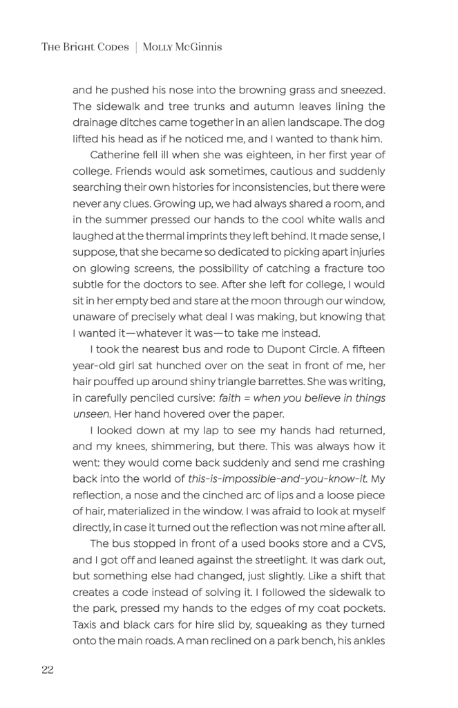Throughout its pages, “The Bright Codes” pays careful attention to the depiction of Catherine and never allows her invisible illness to define her. Instead, McGinnis tried hard to stay away from tropes, and aimed to “write the illness in the context of Cathy, rather than write Cathy solely in the context of her illness.” While Lisa’s invisibility is described in vivid detail from the beginning of the story, the sudden illness that Catherine develops in her first year of college is unexplained until three-quarters through the plot, but the information doesn’t feel withheld. Instead, the absence of naming the condition allows Cathy’s experiences to never feel pathologized within the story. We do not need a name to understand what is happening to Catherine and Lisa: we can see from their eyes ourselves. At no point in the story do Catherine’s experiences with unreality diminish her authority or intellect and instead, she remains a guiding, grounding force within the narrative.