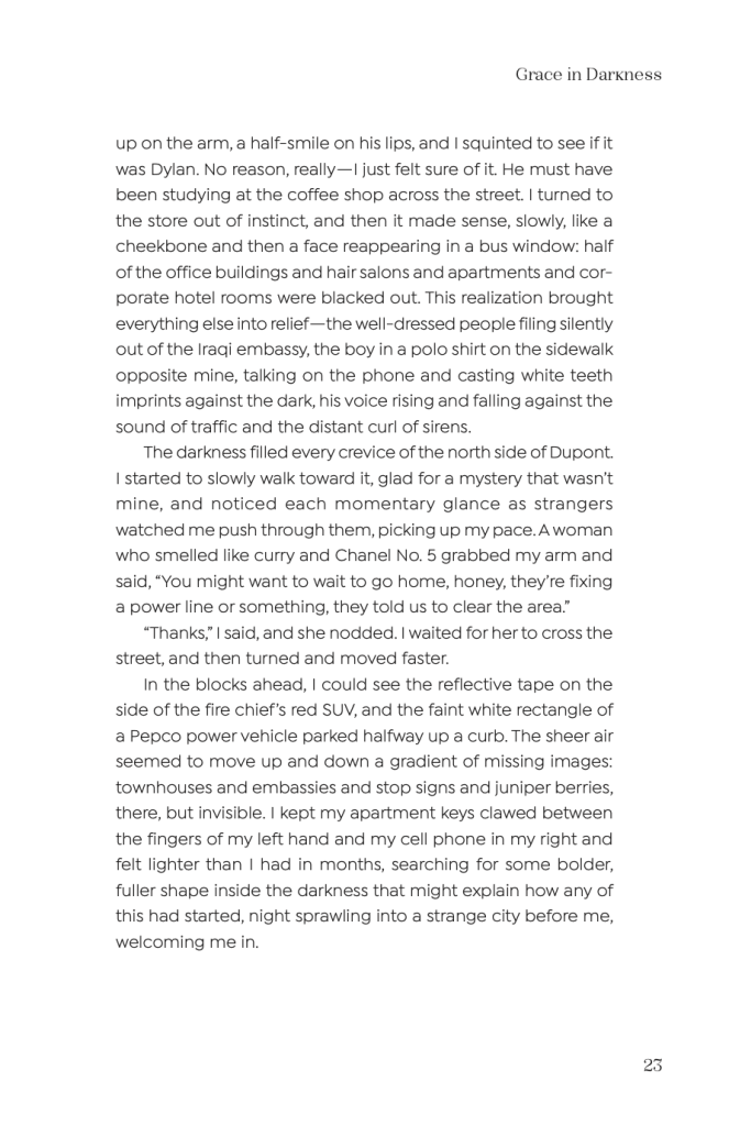 “The Bright Codes,” featured in Grace in Darkness, is told from the first-person perspective of a college student named Lisa as she watches herself fade in and out of reality while, “in the rest of the world, real crises continued to occur.” Lisa’s invisibility begins when she notices that the middle joint of her index finger is invisible, but tangible, almost as if it were a hidden sliver of the moon. She remarks that, “there’s no way to prove that this is real; all people ever notice is that I’m missing, like I just didn’t show up. They don’t ask why.”