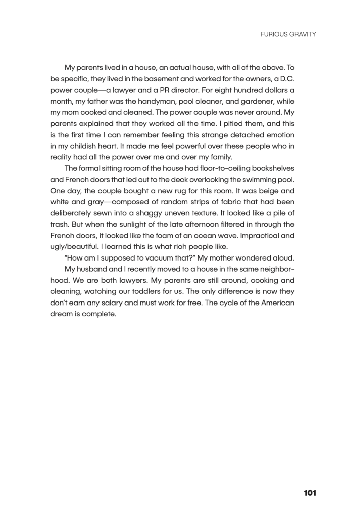 “My husband and I recently moved to a house in the same neighborhood,” she writes. “My parents are still around, cooking and cleaning, watching our toddlers for us. The only difference is now they don’t earn any salary and must work for free. The cycle of the American dream is complete.”