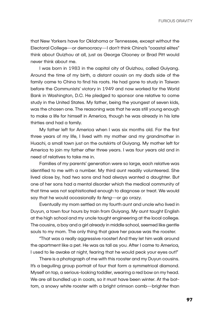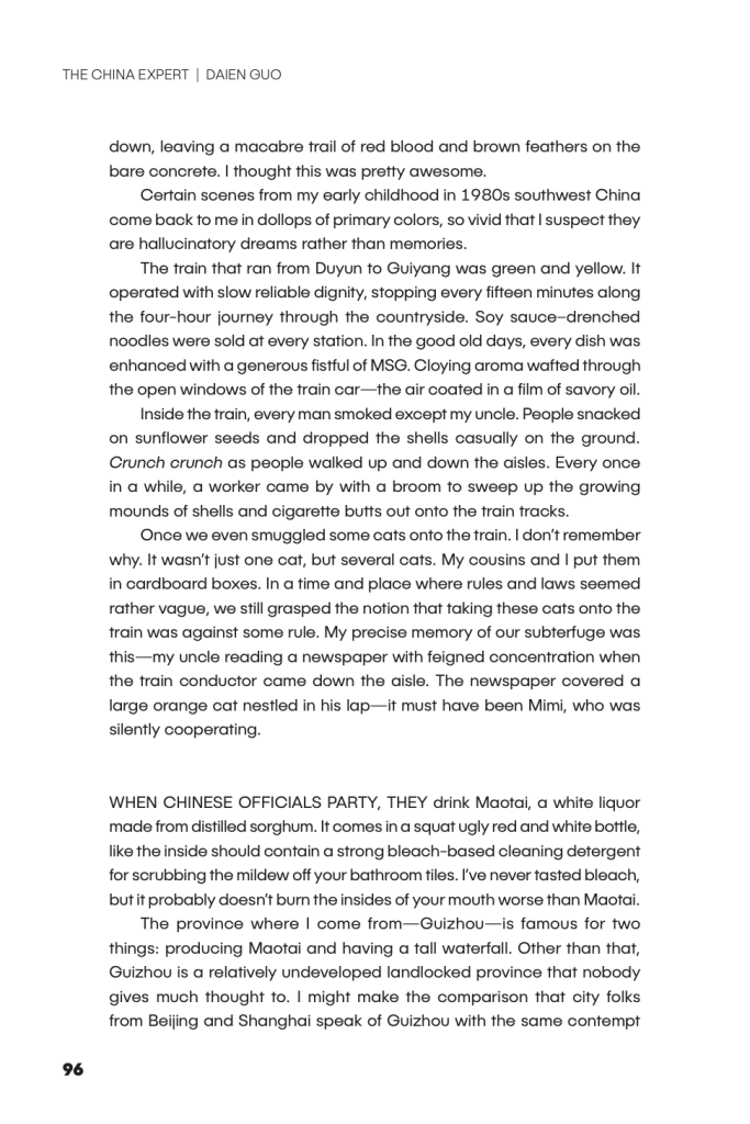 This sense of sentimental nostalgia permeates every word, as does a wonderful sense of irony–the piece is bookended with anecdotes that reflect on the cyclical nature of the American Dream. Immediately conjuring images of a staid government official both representative of the larger than life image of the Chinese government and western perception of China and Chinese people, Guo then proceeds to unearth a different kind of “China expert’: a child growing up in small town China, left behind by parents pursuing the American Dream in the tender care of relatives. Falling cats, de-feathered chickens, uncles, cousins, rivers and mountains, abundant food and quiet sacrifice weave a story of childhood that is quirky and warm, never emphasizing, but also never letting us forget, the child who was left behind, waiting. The China of her childhood memories is a study in contrast, full of love, color, and character, far removed from the tired cliches of the Chinese government put forth by obtuse coworkers. She describes it with love, colorfully and cleverly. Green and yellow trains, soy-drenched noodles; sunflower seed shells crunching on the floors of rail cars, cats in cardboard boxes and crimson roosters.