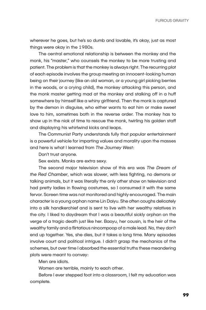 These musings on childhood past are intercut with observations on culture and politics that foreshadow the adult she will become: Guo describes in detail two seminal television programs that were popular during her childhood as both entertainment and propaganda, her use of irony firing on all cylinders as she writes, seemingly to the very white men whose drudgery prompted this current of introspection, that “The Communist Party understands fully that popular entertainment is a powerful vehicle for imparting values and morality upon the masses,” with reference to television shows The Journey West and The Dream of the Red Chamber. I’m sure, though, not one of them could wait for the new Top Gun.