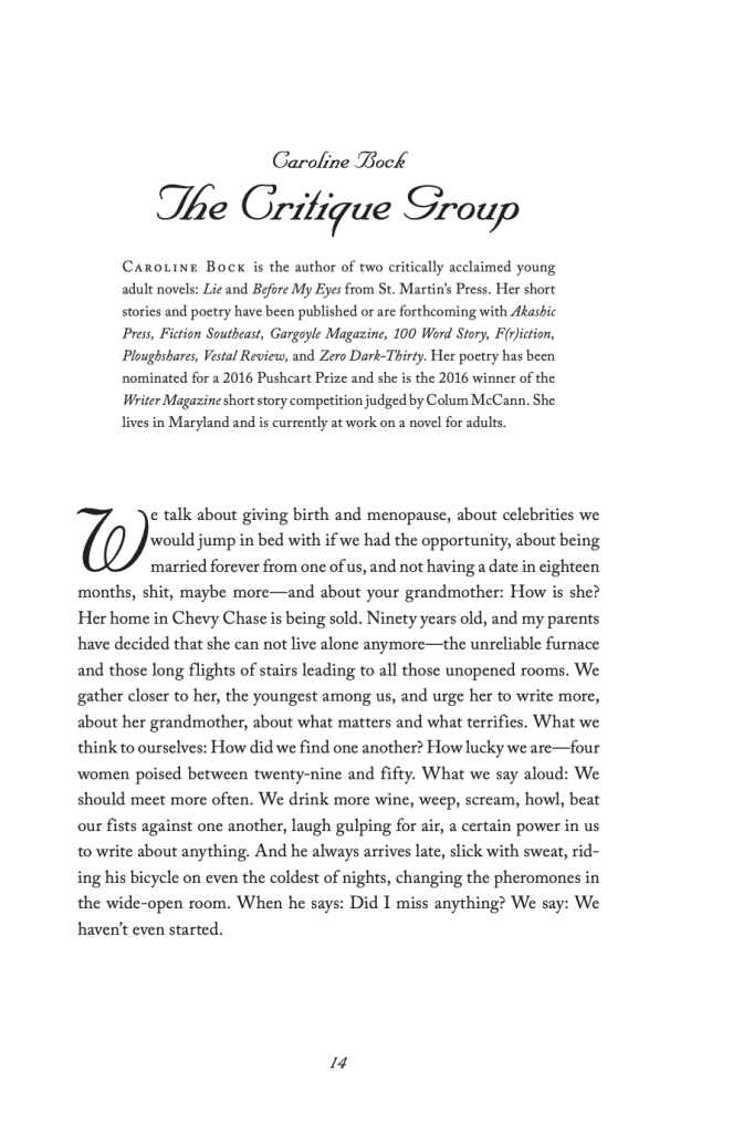 Caroline Bock is the author of Carry Her Home, winner of the Fiction Award from the Washington Writers’ Publishing House, and LIE and Before My Eyes, young adult novels from St. Martin’s Press. The winner of the Writer magazine story award and the Adrift short story award, her creative work has also recently appeared in SmokeLong, Brevity, Gargoyle, Grace & Gravity: DC Women Writers, Jarnal and more. She is the co-president at the Washington Writers’ Publishing House, a nonprofit independent literary press based in Washington DC. A graduate of Syracuse University. she studied creative writing with Raymond Carver, and earned an MFA in Fiction from the City University of New York. She lives in Maryland with her family and is at work on a novel. To learn more about Caroline Bock’s work, visit her website.