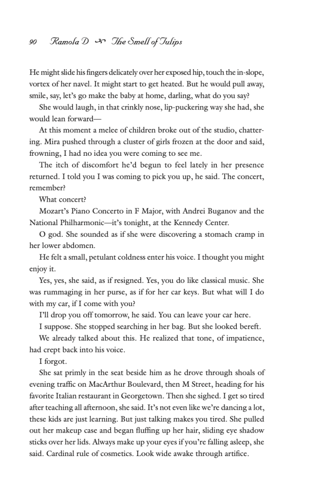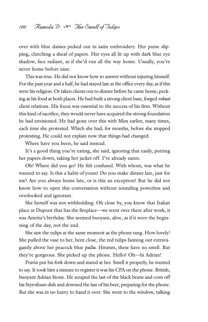 “The Smell of Tulips” is written in the third person following the relations between a married couple navigating an immigrant identity and relationship in contrast to American culture. In order to depict this dynamic, Ramola follows the narrative from the perspective of the husband, Pravin, and the entire story is revealed through his views on American culture and his relationship with his wife, Mira. He carries the voice of the piece, which is conflicted and restless. The following excerpt is a precise example of Ramola’s beautiful use of poetic language to depict this conflict from when Pravin sees Mira teaching dance in slacks and a sweater: