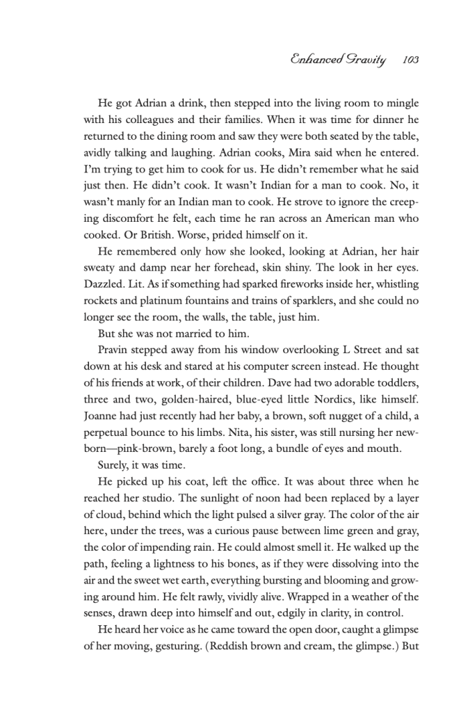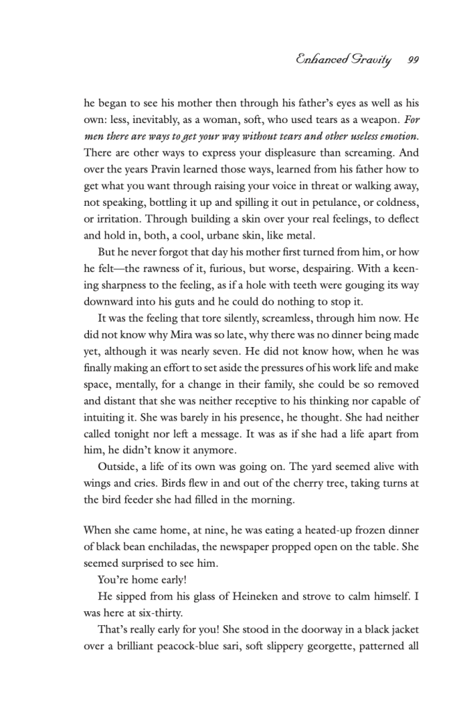 To further understand Pravin’s biases and where his voice stems from, Ramola articulates an important characteristic that shapes people’s perceptions: family. Regarding his expectations, we as readers can see that his thoughts stem from a toxic cycle. His voice is not just his own – it is a reflection of years of patriarchy and toxic masculinity he has grown up seeing. When Pravin acknowledges that “even on the days when he was silent with his mother, his father let him privately into his confidence, so he began to see his mother then through his father’s eyes as well as his own: less, inevitably, as a woman, soft, who used tears as a weapon”, we can understand that Pravin’s view of a woman comes from his father, whose perspective of women might have passed down generations. Through Pravin’s complex voice, Ramola allows readers to explore a less conventional perspective in understanding why toxic masculine mindsets are the way they are: from the perspective of the man himself. The analysis of this marriage from Pravin’s point of view depicts the external impact of a patriarchal mindset on a relationship but also further pinpoints the internal conflicts that emerge from specific cultural roots.