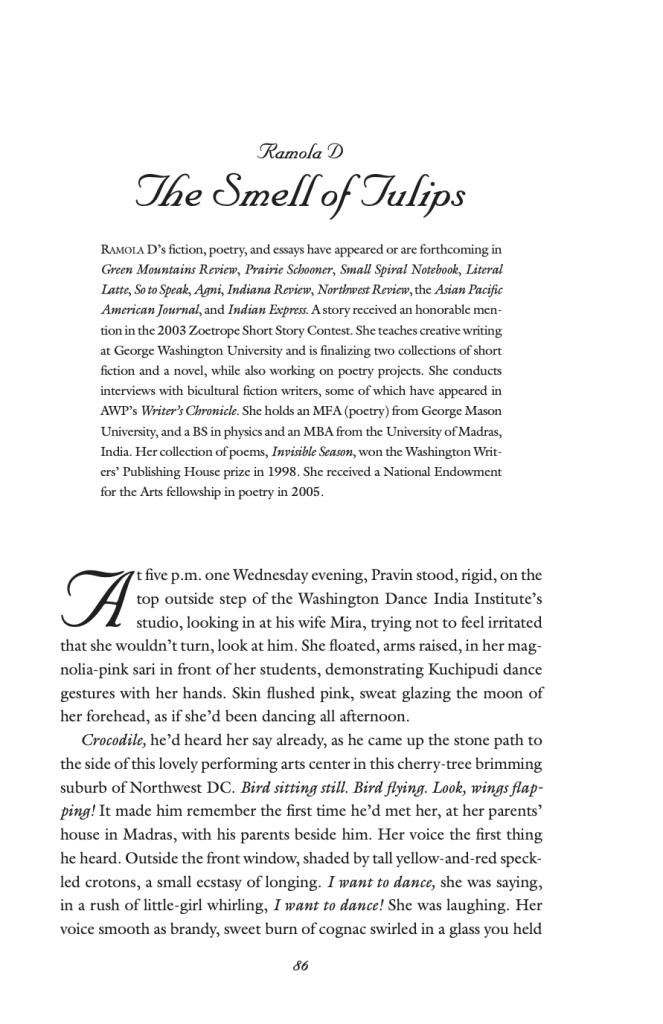 Ramola’s thematic approaches to South Asian culture closely align with her background and primary focus as an author. She was born and brought up in a city formerly known as Madras and now as Chennai, located in Tamil Nadu, India. Her first exposure to the DC writing scene emerged following her MFA education at George Mason University, after which she took on various roles in the writing community, such as being an instructor at educational institutions and volunteering to teach writing workshops at homeless shelters. Her writing style ranges between fiction, poetry, and essay, which is evident in the ways she is able to incorporate poetic writing devices and make fictional stories such as “The Smell of Tulips” feel alive and real.