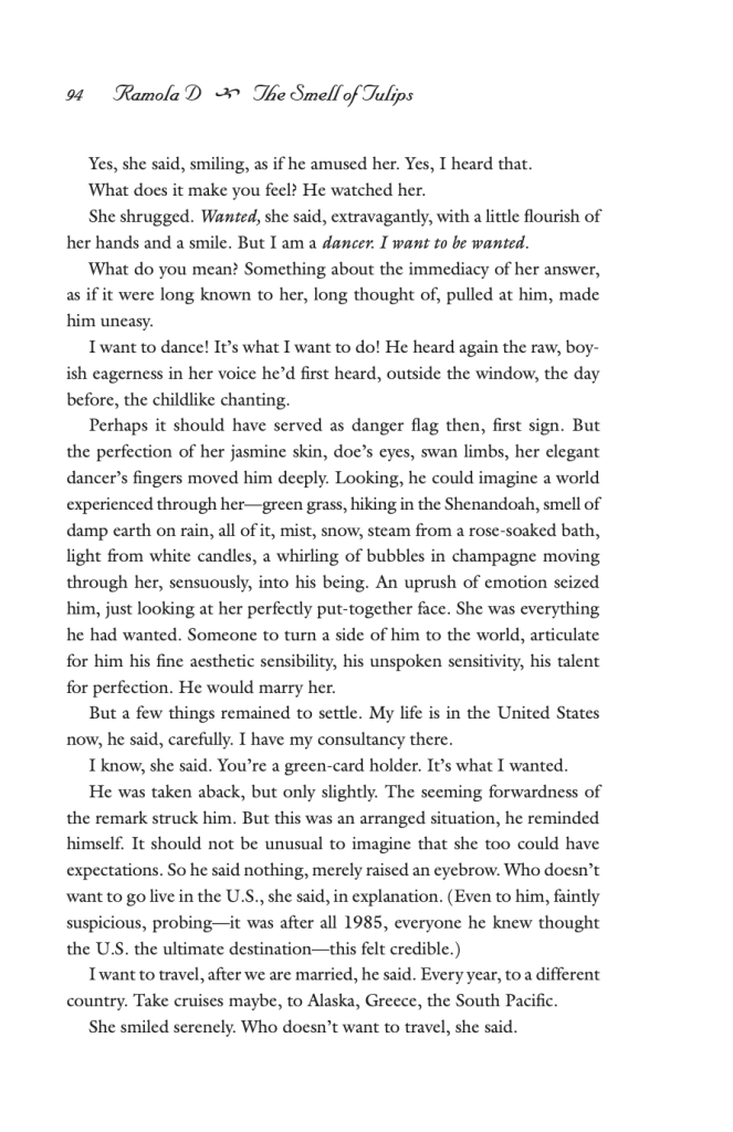 “The Smell of Tulips” falls well within the thematic choices that often underscore other works by Ramola. Her other fiction short stories are also a careful, analytical dive into the complexity of relationships. In another one of her short stories, “In Another World”, Ramola similarly explores family dynamics and the impact of those perspectives on external relations, all while emphasizing significant moments through her articulate use of poetic vocabulary and distinct contrasts. In one particular moment, the main character in this story thinks of someone and “how he must sit, up in the guard tower at the Kasimpur railway station, waving the trains on, slowly, meticulously, the green cotton flag, the crimson flare, how the gods and lucifers and satans of his children’s visions must pass before him like crowned and haloed figures from a dream”. Although a short excerpt, the vivid imagery, and language in it make the railway station come alive. To readers, it brings emotion into relationships and life into something as stationary as a railway station, or as in “The Smell of Tulips”, to America and Mira’s dance studio.