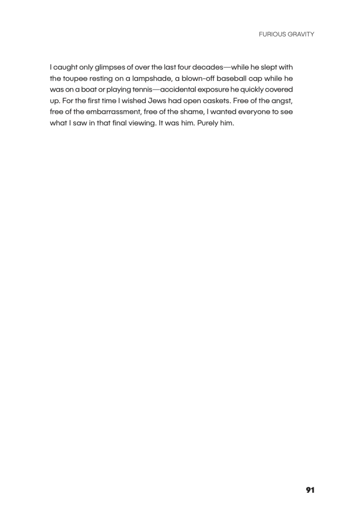 Such a touching tribute to her father showing the tender love between a father and a daughter. The story concludes with her father’s funeral with the toupee removed, it was no longer needed in death, revealing what it covered for so many years. The author even questions the need for it in life. So many years between the man without the toupee and the one with it, she gently shares, “There in the casket, laid bare, his beautiful bald freckled head, the one I kissed, rubbed, and held on tightly to until I was eight.”