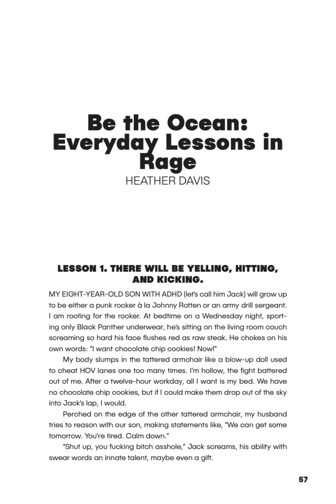 HD: To be honest, it’s trial and error for me. I did not have a particular structure in mind when I started writing but knew pretty soon that I wanted to break it up into sections. Reading other essays is probably the best way to get ideas for different kinds of structures to use. I did know I wanted to end on the idea of being like an ocean and I wanted to open with something compelling, so the description of physical aggression seemed to fit that bill. The second section is about the growing realization of the role anger can play and the third section is a sort of rallying point where I own my kid’s behavior and how we parent. It may be easiest to just get a rough draft of all your thoughts down on paper and then go back to see where the natural breaks may be. At that point, you can also mess around with telling a story backwards or jumping around in time. I think every piece is different and there are lots of creative ways to structure any essay.