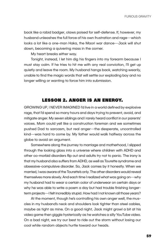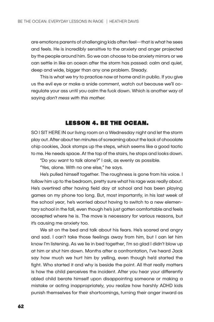 Davis is a natural storyteller; she gives valuable information easily without the mundanity of definitions and overcomplicated concepts. Every lesson section has something to learn, whether it be about ADHD, parenthood, or personal growth. “Lesson 3: Don’t Mess With This Mother” highlights a term that the narrator has recently discovered, co-regulation. “Co-regulation means controlling our own emotions and reactions as parents to help the child better regulate his or her own feelings. It means we are in this together. It means my ability to cope is or will become your ability to cope. It is the opposite of the old-school authoritarian discipline that is usually a disaster for ADHD kids.” In these four sentences, the reader learns a parenting technique, some historical context about children with ADHD and their education, and the reasoning behind her reaction to Jack’s meltdown earlier.