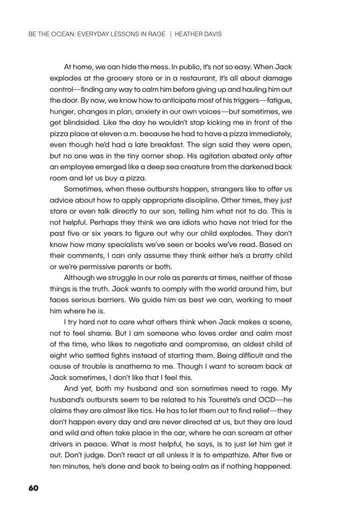 Heather Davis’s essay “Be the Ocean: A Lesson in Rage,” published in Furious Gravity, is about parenting a neurodivergent child. The themes include parenting, emotional intelligence, personal growth, and family. Davis talks about creating a safe environment where we can embrace, rather than judge, our initial emotional instincts while also learning how to control them. Through her writing, Davis warmly invites us to grab a seat on the couch and learn with her.
