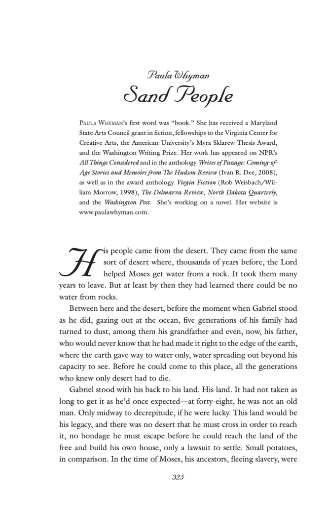 “Sand People” is a story that can connect to everybody’s life experiences, as we all live our family legacies as part of our identity. If we are not “sand people,” we may be “American people,” or “Asian people,” or “technology people,” or “nomad people.” These lineages and legacies become our home bases and define who we are. Whyman admits that she might want to change the story if she were writing it today, because she has changed through the years, and so should the characters. But Whyman is still writing. Writing is her home base.