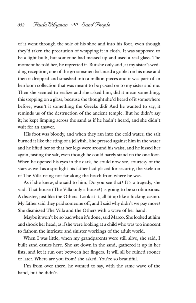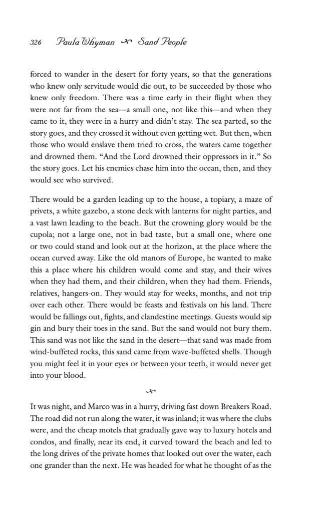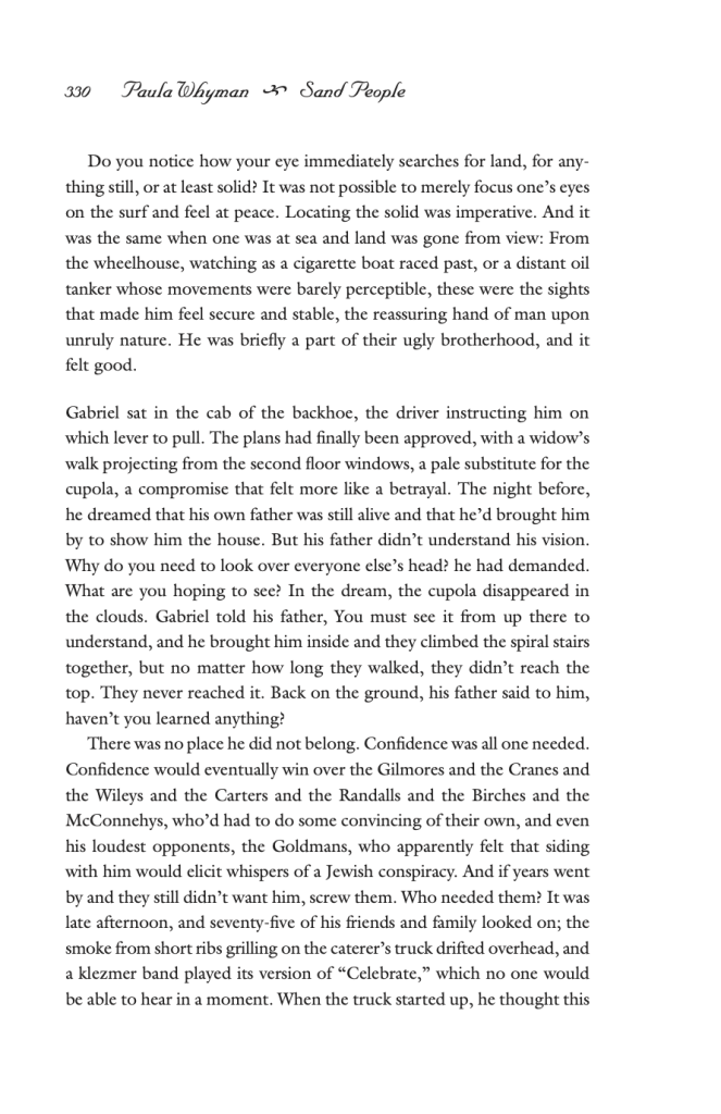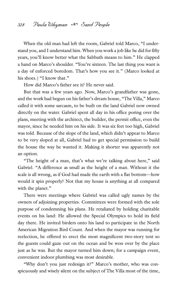 “Oh, that’s a really good question. Luckily, even though I wrote that 14 years ago, I think I do remember what it was about, because my husband grew up going to a particular beach on the New Jersey seashore….” That seashore got built up over the decades. People kept building new private upscale homes, adding layers and layers amongst the old homes. “There was one that was being built near the place where he went to the beach, so I started wondering what kind of person builds that house.” This homeowner was the kind of character that Whyman “didn’t necessarily sympathize with,” but she tried to write the character from his own perspective and to understand his way of thinking.