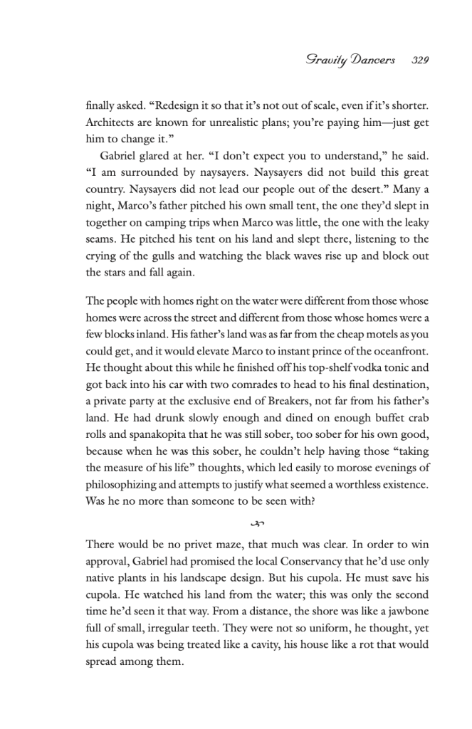 The house and the land are symbolic of Marco’s family legacy. Marco’s dad Gabriel, the landowner and the house-designer, is in the middle of disputes with land use committees and the local conservancy—“the architect, the builder, the permit office, even the mayor”—on his large-scale villa plan, which is marked by a tall cupola. Even Marco speaks of Gabriel’s idea with sarcasm. Though the plans were finally approved, with a widow’s walk replacing the cupola, to Gabriel it was “a compromise that felt more like a betrayal.”