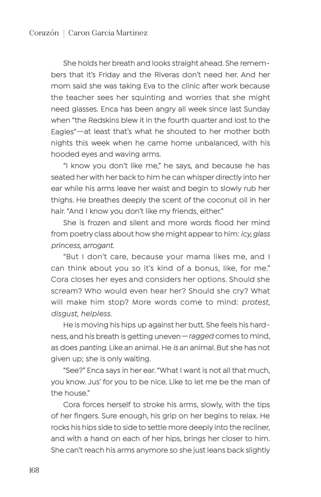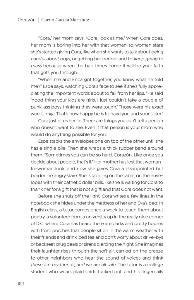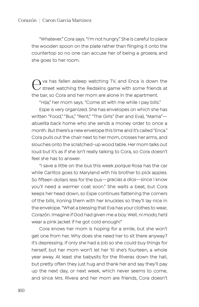 The story follows thirteen-year-old Cora, who recently immigrated to the United States from Mexico with her mother, Espe, and her younger sister, Eva. In DC, they live with Espe’s boyfriend, Enca, and with him around, the apartment is anything but a home to Cora. Harassed by his unsavory friends, his violating gaze, and his inappropriate touches, she struggles to find any escape and dreams of being back in Veracruz with her abuelita.