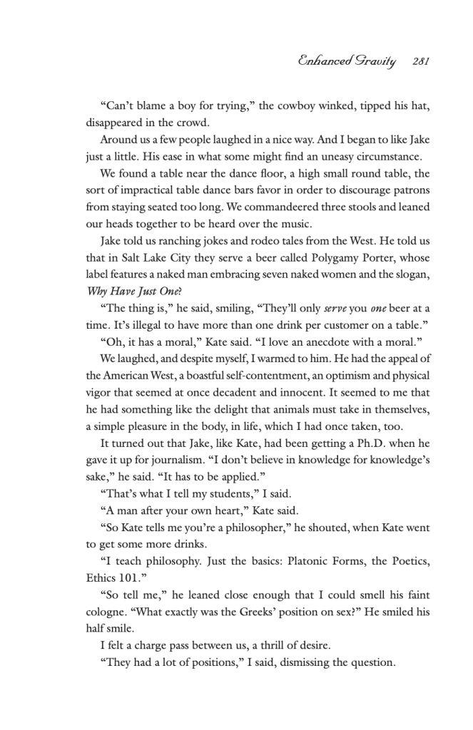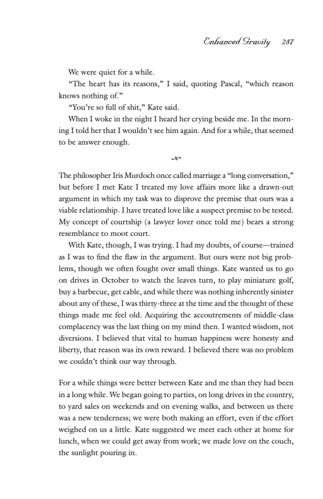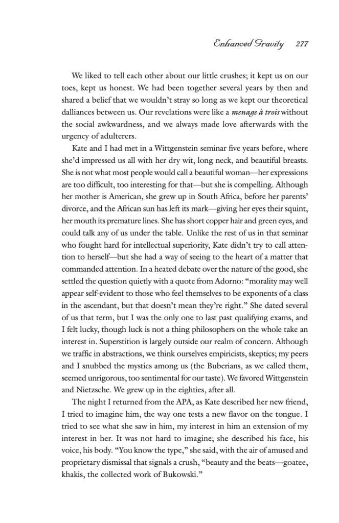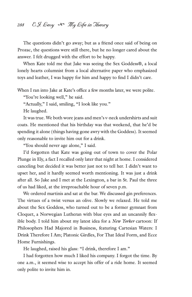 Levy handles the conflict with grace, and her erudite approach to the philosophies of love simultaneously creates distance between the narrator and her feelings and then closes it through the apparent comfort that academia can bring. Levy writes: