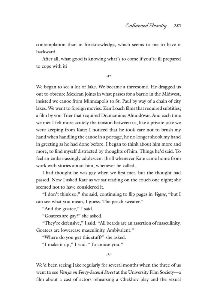 “Lesbians are often accused of narcissism—our love of women blamed on a hatred of men or a hatred of our mothers or a thwarted maturation that has locked one in pursuit of an adolescent mirror image of oneself—as if a woman simply loving another woman were inexplicable without reference to aversion or impediment. But this, in my experience, could not be more wrong. I have loved women because they are beautiful, because they are tender or brilliant, because I am moved by them. When I fall for a man, as I fell for Jake, it’s because he reminds me of myself.” (289)