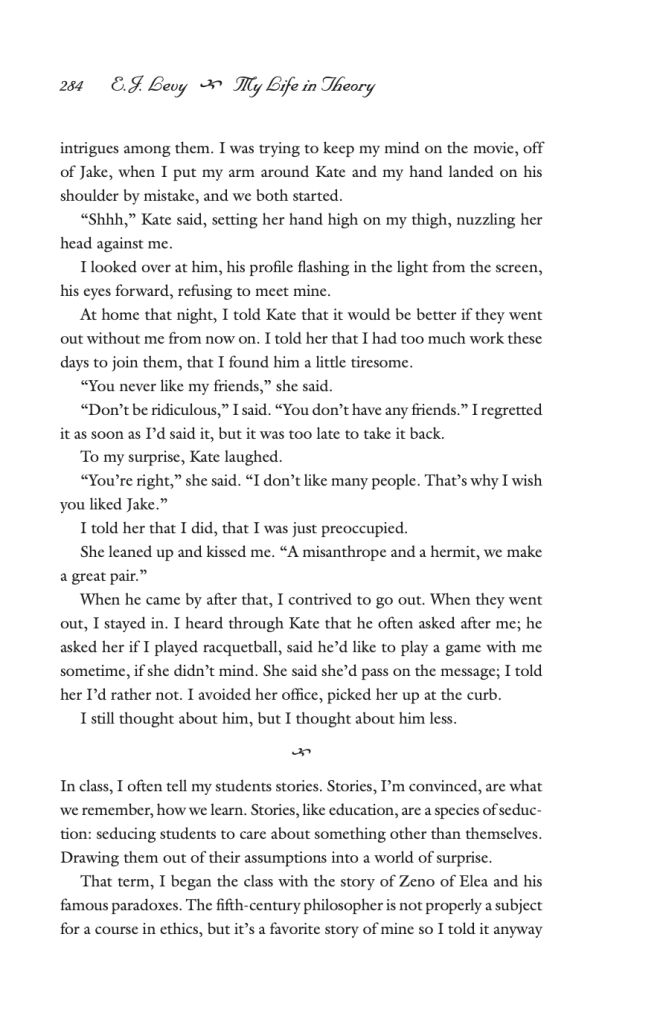“My Life in Theory,” is the story of a philosophy professor whose long-term relationship is challenged when the narrator finds herself drawn to her partner’s new friend. Using philosophy as a framework for understanding, Levy’s excavation into the narrator’s relationships goes deep into love and loss, examining desire:
