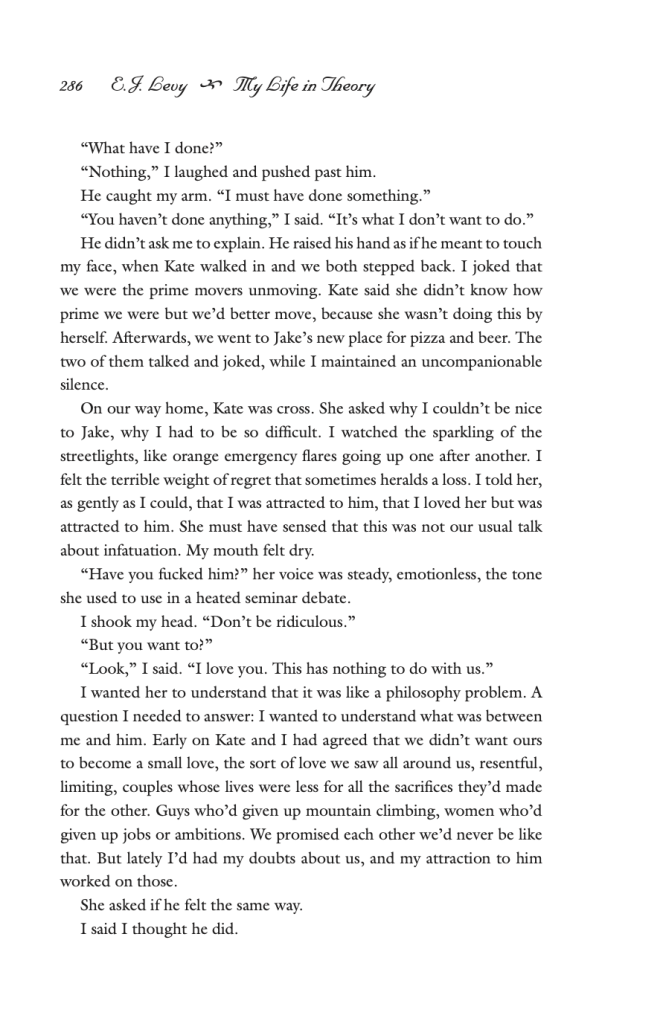 The desire in “My Life in Theory,” beyond being adulterous, is fraught with the complexities of sexual orientation as well. For much of the piece, Levy keeps the gender of the narrator ambiguous; it’s not until fourteen pages in that there’s an explicit mention of the narrator’s sexual identity. Levy writes: