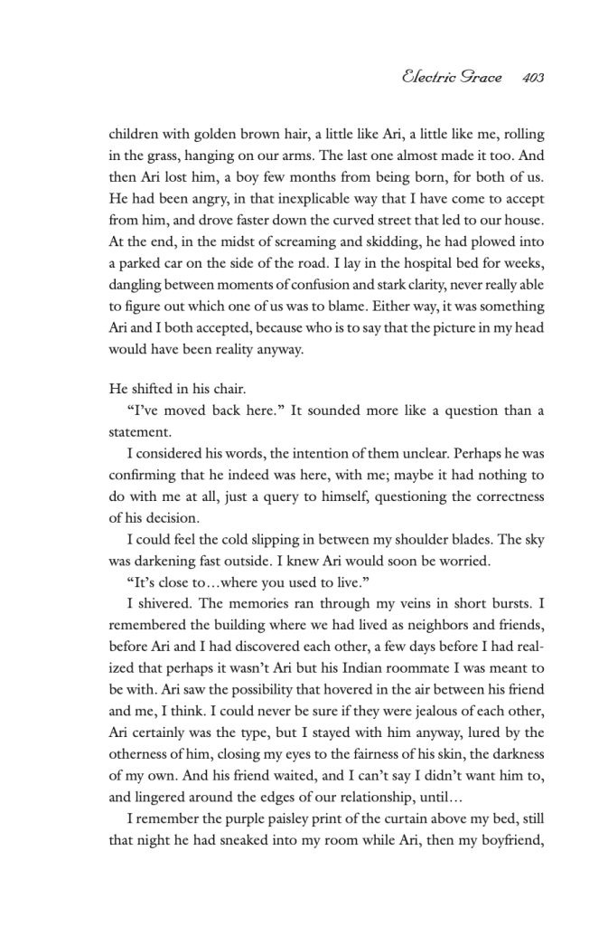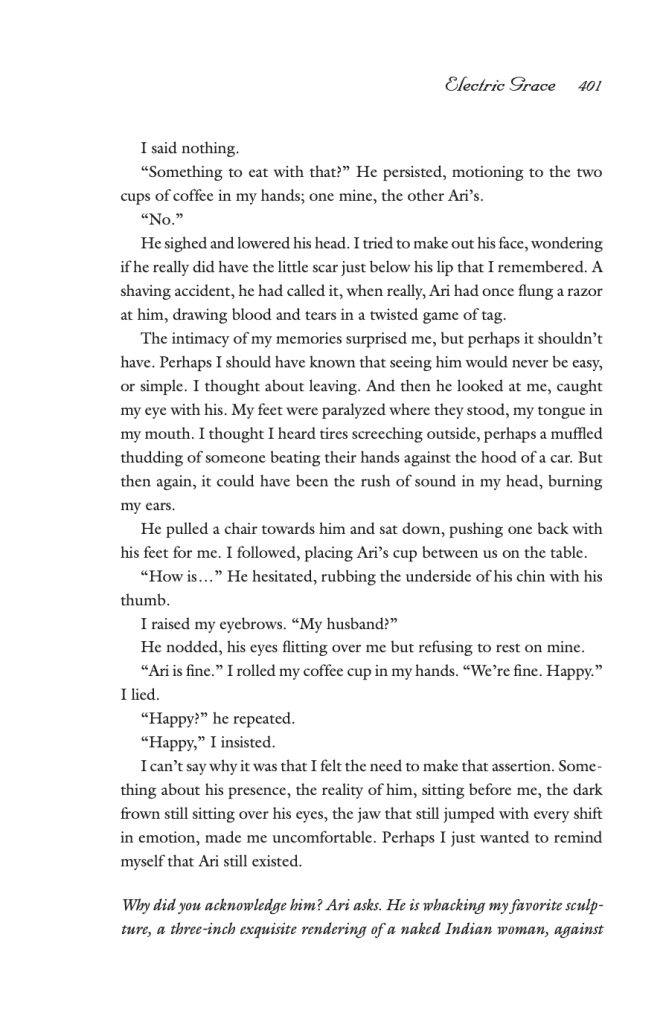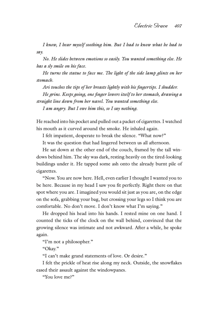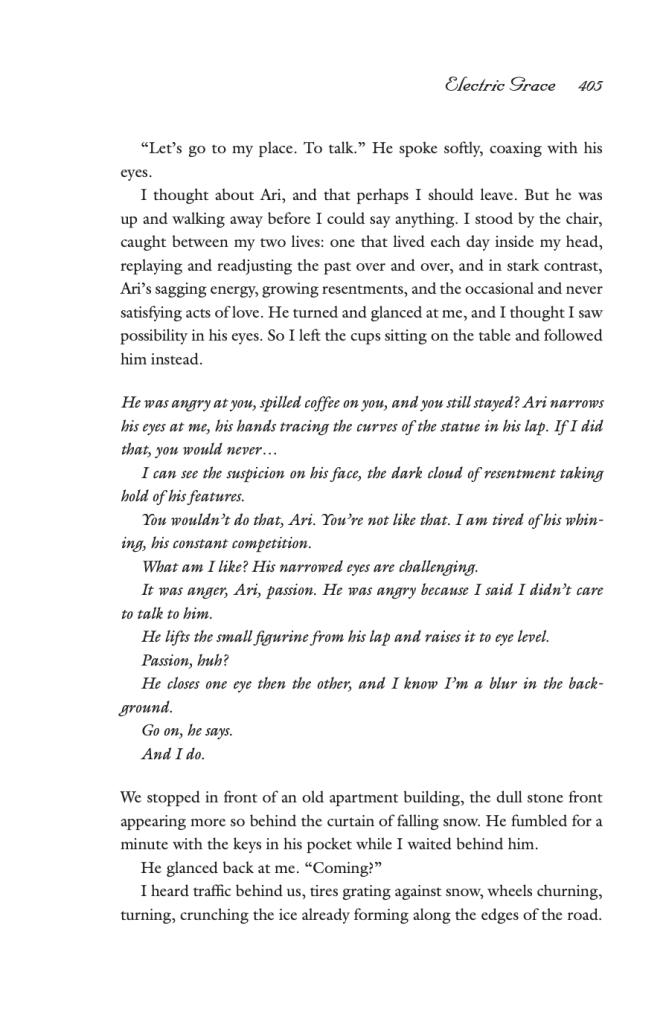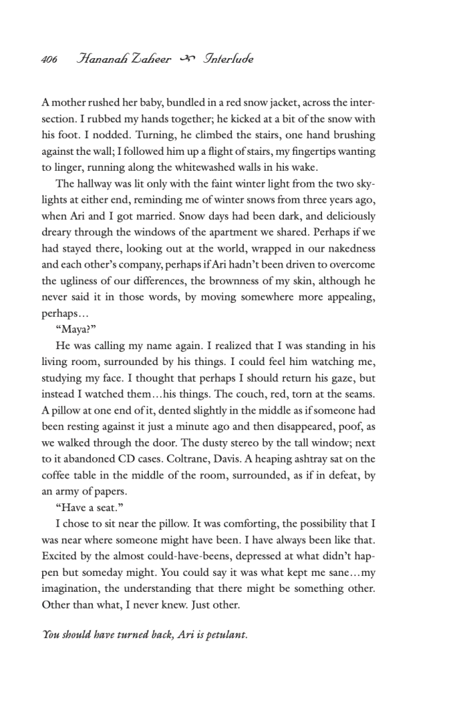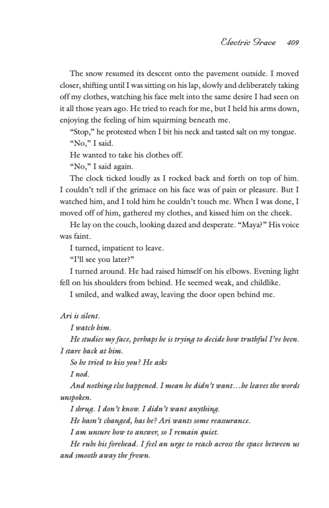 When she returns home to her husband, we see her explaining that she saw Ari’s old roommate again at the coffee shop, and that she did not blow him off completely, like Ari would have wanted. In these flash- forward scenes, the writing is very to the point, almost cold and clinical, directly contrasted with the description of the unnamed man who she was just with. It is as if any spark there was with Ari is well and truly dead. Now that the last loose end of this relationship, the potential connection with the ex-roommate has been explored, Maya is done and ready to check out of this chapter in her life. In a way her actions are a rebellion against her husband, and a welcome back to herself.