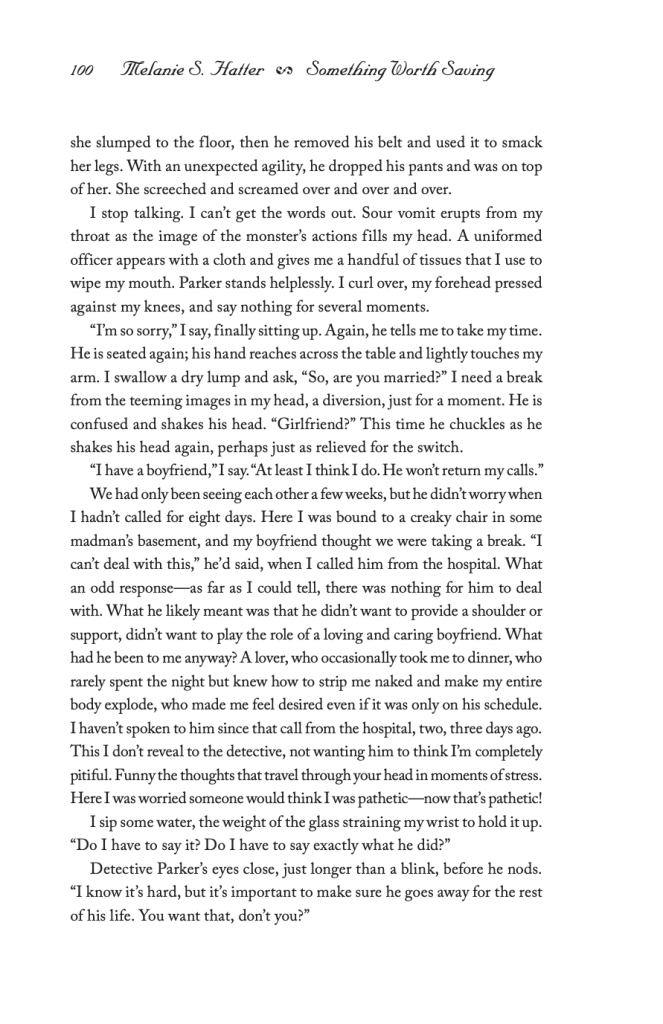 Although Hatter is comfortable exploring the tragically uncomfortable in her works, Something Worth Saving is a bit of an outlier in its overly graphic details. In no other story are the details as vivid; even in Malawi’s Sisters, although a report of a murder, the novel’s focus is how the family deals with their loss, not the crime scene. To wallow in those details would come off as trauma-porn, which is never Hatter’s intent. In Something Worth Saving, the graphic nature of the crime details is vital for the reader to realize the heart of this tale; how PTSD crushes a victim’s self-worth. How surviving a terrifying injustice is mind and often life-altering. The question of “Why Me?” tends to haunt and paralyze a victim. The protagonist lives an average life, nothing exciting, nothing major, and she doesn’t see herself as something worth saving, Hatter explains. Survivor’s remorse, accurate and seriously debilitating, puts the narrator’s life in jeopardy long after the physical threat is over. How can she reconcile feelings of worthlessness?