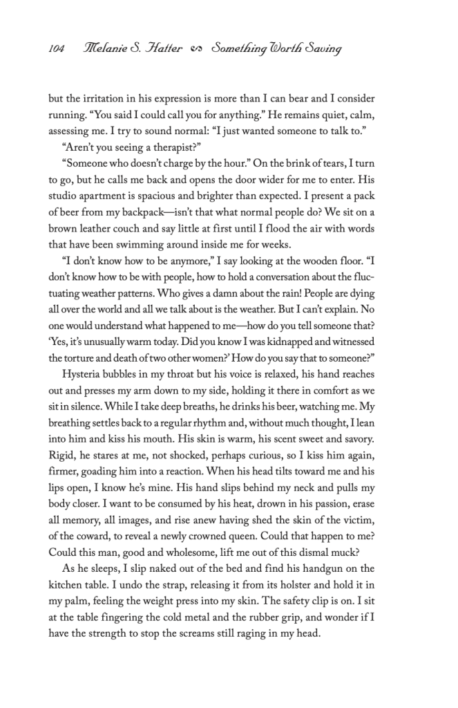 A disturbing opening line, “Every day I hear them screaming, and the only way I can think of making it stop is by firing a bullet into my brain., sets a tone reminiscent of procedural crime shows, which, as it happens, is its inspiration. Hatter admits, “I love cop shows. I watched a lot of CSI and Criminal Minds; those two shows are intense. I give them credit for this story because I was caught up in those bizarre shows.” I concur; it’s a guilty pleasure of millions, my mom included, so I’ve seen my share. Episodes formulaically end with the victim saved and the criminal defeated; everything neatly wrapped up. As we all know, life doesn’t always work out that way. Crime and victimization is a messy business that leaves its gory remnants long after the scene has been scrubbed clean. Something Worth Saving takes the reader there, following the victim past the darkness of a traumatic experience into the paralyzing anxiety and terrors of Post-Traumatic Stress. Through Hatter’s masterful use of evocative sensory description and choice of first-person narrative, the reader transports into the dark recesses of humanity. Hatter felt this story had to be from the victim’s point of view; it wouldn’t have had the same power in the third-person or omniscient voice. This story is inherently about what is happening inside this troubled character’s psyche. She’s had this experience and the confusion about how or if to continue living with its unbearable weight.
