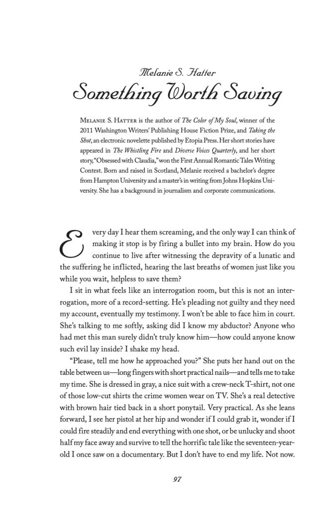 “Something Worth Saving” is a shocking crime story investigating the aftermath of the victimization of the most insidious crimes of abduction, rape, and murder, written in uncomfortably graphic detail. I loved it. However, a reader advisory is recommended. It’s highly provocative prose. I was riveted until its solemn last line in its grizzly grasp from the open. The focus is not so much on the crime but the victim’s journey after her rescue to reassemble a shell-shocked existence, if at all possible. It is part of the compelling, self-published short-story collection, Let No One Weep for Me: Stories of Love and Loss, which attentively explores the heartache of loss and the peace of discovery. The author, a lovely, soft-spoken writer, Melanie S. Hatter, begs the question, “How do you recover a life after surviving something so sinister?” Too often, crime stories, on the page and screen, delve deep into investigations and resolutions that exclude the messy details of victimization’s aftermath. What happens to these broken people? How do they re-enter a shattered life? Hatter offers up a compelling, honest explanation in this incendiary short story.